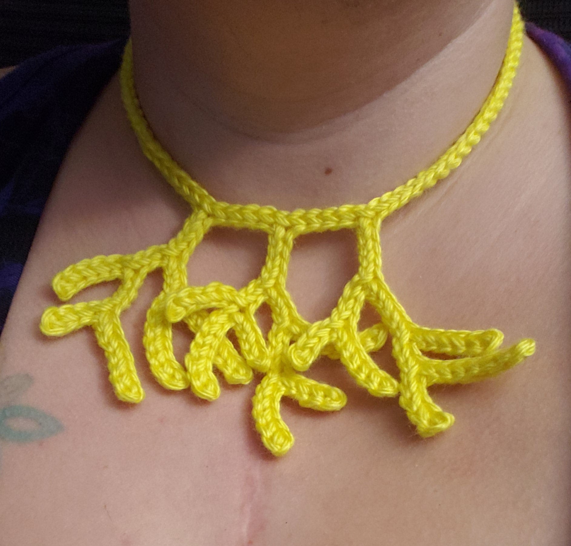 This crochet necklace is a unique and fun way of celebrating the ocean! Made to look like branching coral, it is available in three, five, seven, or even nine main branches and is clasped in the back using an actual shell. The yarn is soft and the piece light, so you can wear it all day without realizing it!